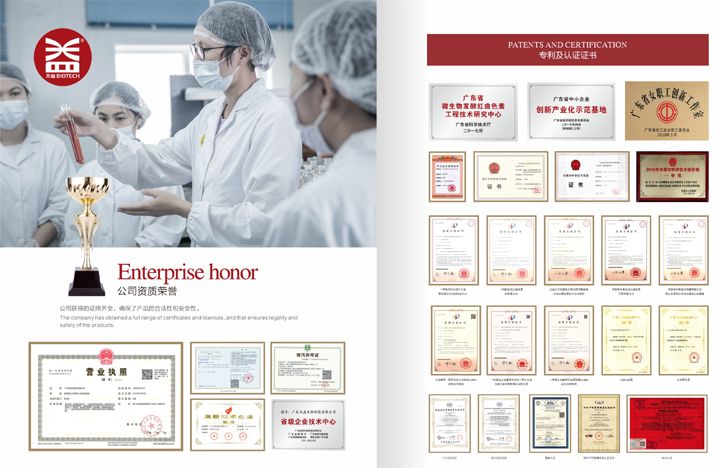 國(guó)家高新技術(shù)企業(yè)、廣東省省級(jí)企業(yè)技術(shù)中心、廣東省微生物發(fā)酵紅曲色素工程技術(shù)研究中心、等10多項(xiàng)和20多項(xiàng)發(fā)明專(zhuān)利,是中國(guó)食品添加劑和配料協(xié)會(huì)理事單位和中國(guó)生物發(fā)酵產(chǎn)業(yè)等協(xié)會(huì)會(huì)員單位。通過(guò)了ISO22000食品安全管理體系認(rèn)證、誠(chéng)信管理體系等認(rèn)證。