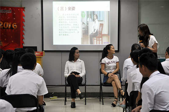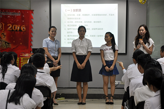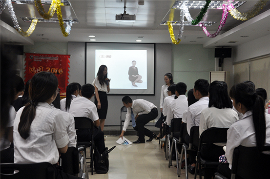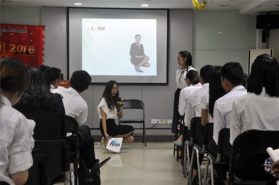 首先,姚老師讓三位女同事上到講臺,從衣服、鞋子、首飾等方面著重講解了女職員應該注意的儀容儀表。