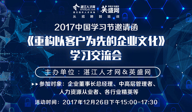 湛江人才網(wǎng)作為中國(guó)學(xué)習(xí)節(jié)湛江分會(huì)場(chǎng),12月24日-28日將為湛江企業(yè)奉上此場(chǎng)全國(guó)頂級(jí)知識(shí)盛會(huì)。同時(shí),12月26日在湛江伯樂(lè)人才市場(chǎng)舉辦《重構(gòu)以客戶為先的企業(yè)文化》的學(xué)習(xí)交流會(huì),100名湛江行業(yè)精英齊聚,現(xiàn)場(chǎng)將有10萬(wàn)學(xué)習(xí)基金抽獎(jiǎng)活動(dòng)。
