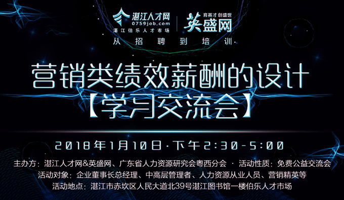 1月10日下午2:30湛江人才網(wǎng)在湛江伯樂(lè)人才市場(chǎng)舉辦《營(yíng)銷類績(jī)效薪酬的設(shè)計(jì)》學(xué)習(xí)交流會(huì),本次交流會(huì)狄振鵬教授將會(huì)給大家分享營(yíng)銷類績(jī)效薪酬的設(shè)計(jì)策略,著重解析營(yíng)銷薪酬的菲爾德法、工資設(shè)定、十大分開(kāi)以及營(yíng)銷高管的薪酬解決方案,幫助企業(yè)高效解決薪酬難題,助力銷售團(tuán)隊(duì)業(yè)務(wù)目標(biāo)穩(wěn)步達(dá)成。