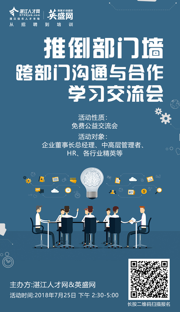 7月25日下午2:30湛江人才網在湛江伯樂人才市場舉辦《推倒部門墻——跨部門溝通與合作》學習交流會,本次交流會主講嘉賓是溝通、談判、管理職業培訓師,上海交大繼續教育學院特邀教授呂憬芊,呂老師將帶你透視跨部門合作的堡壘,實戰研討跨部門溝通有效方法。
